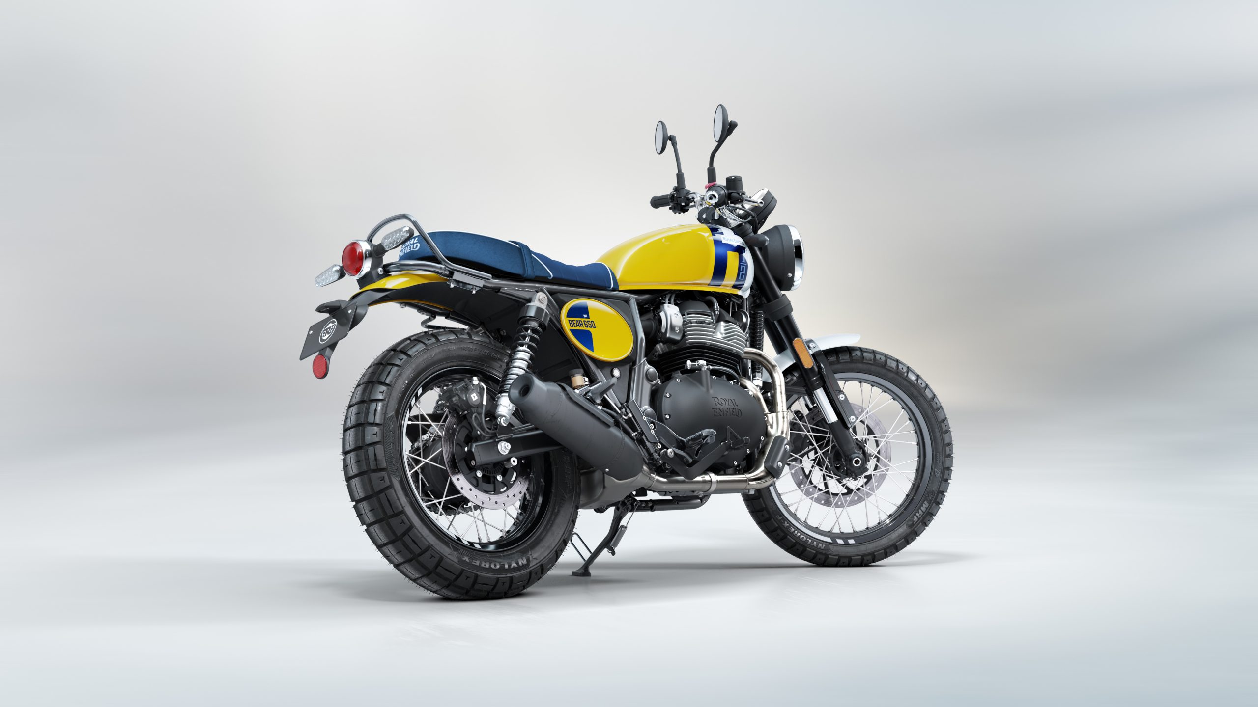 The 2025 Royal Enfield Bear 650 is a road scrambler that pays homage to the spirit of the 1960s Big Bear Run in the Californian desert. Powered by Royal Enfield's proven 648cc parallel-twin engine, it delivers 47.4 PS at 7,150 rpm and 56.5 Nm of torque at 5,150 rpm. The engine features a durable black finish, enhancing its rugged and purposeful appearance. The Bear 650's design includes a 2-1 exhaust system, which not only improves engine performance but also reduces physical size and mass. The motorcycle is equipped with a steel tubular double cradle frame, providing a solid foundation for both on-road and light off-road adventures.
