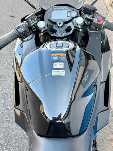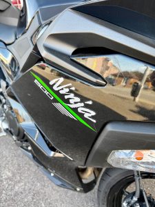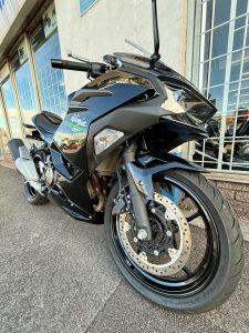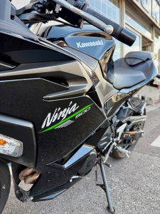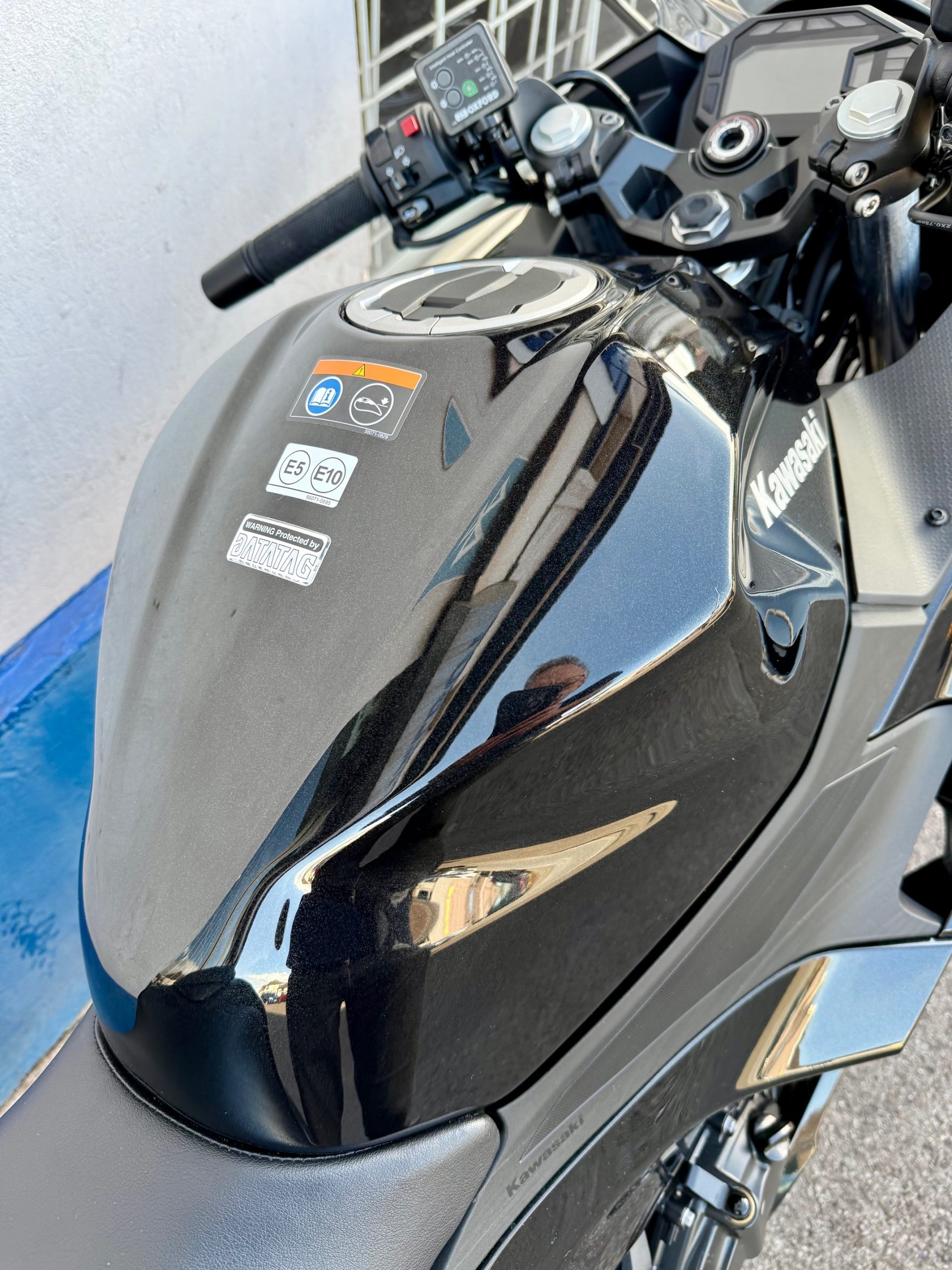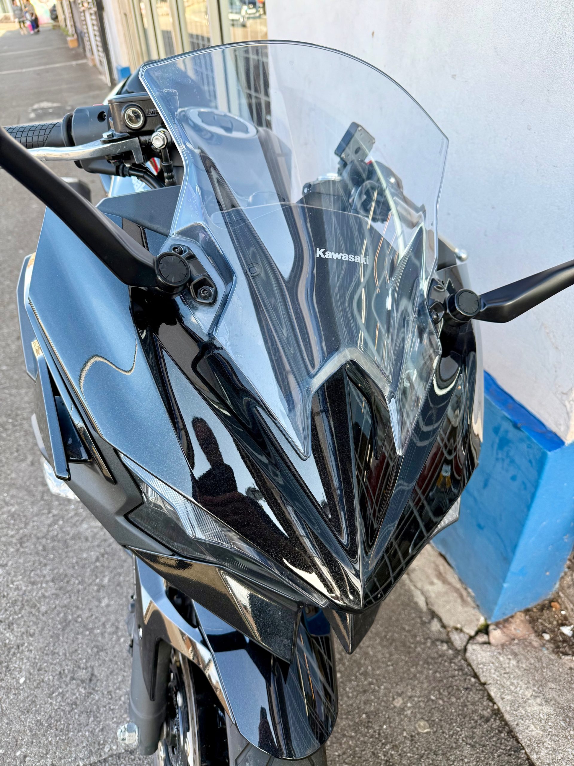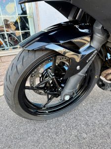 Ergonomically, the bike provides a relaxed yet engaged riding posture, helped by a slightly raised handlebar and footpeg placement. Wide bodywork and thickly cushioned seating offer surprisingly effective wind protection and comfort for longer rides, while a bold Ninja-style “face” gives the bike a distinct, aggressive presence on the road.