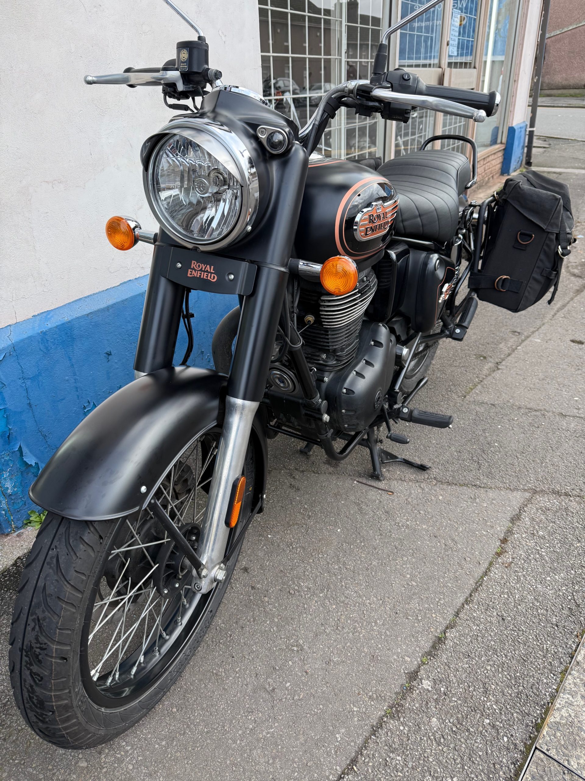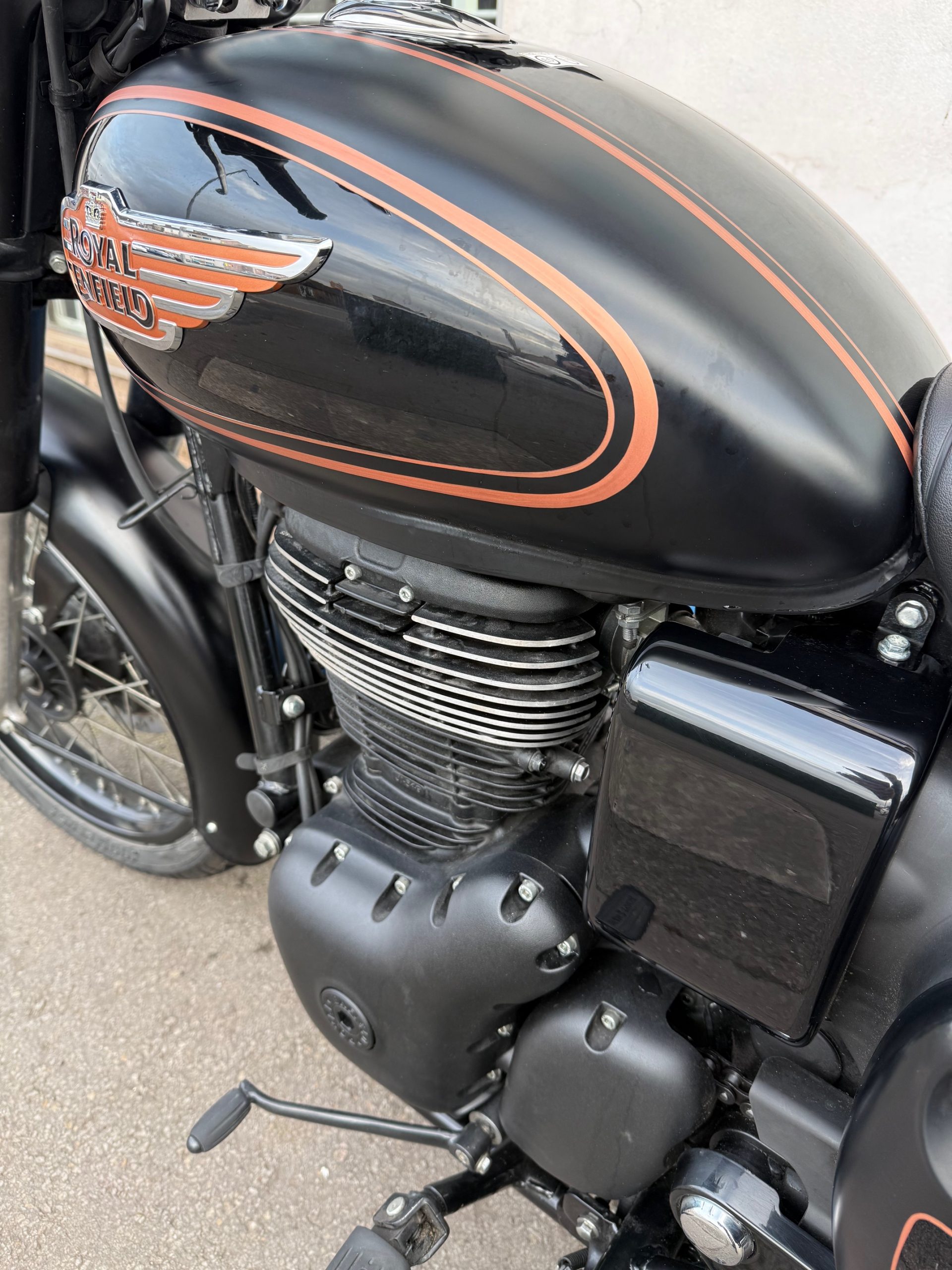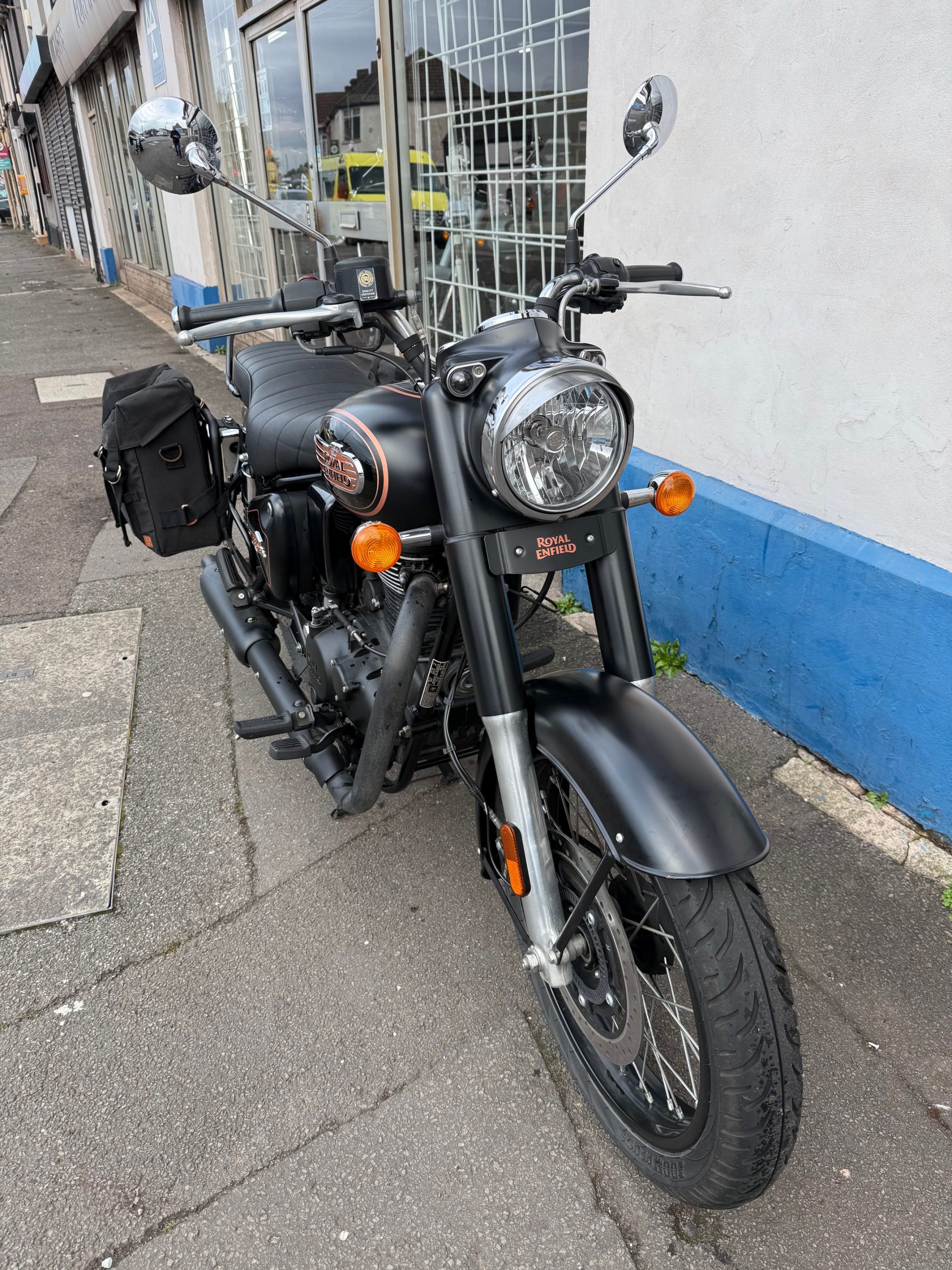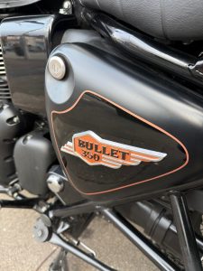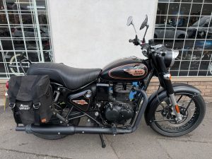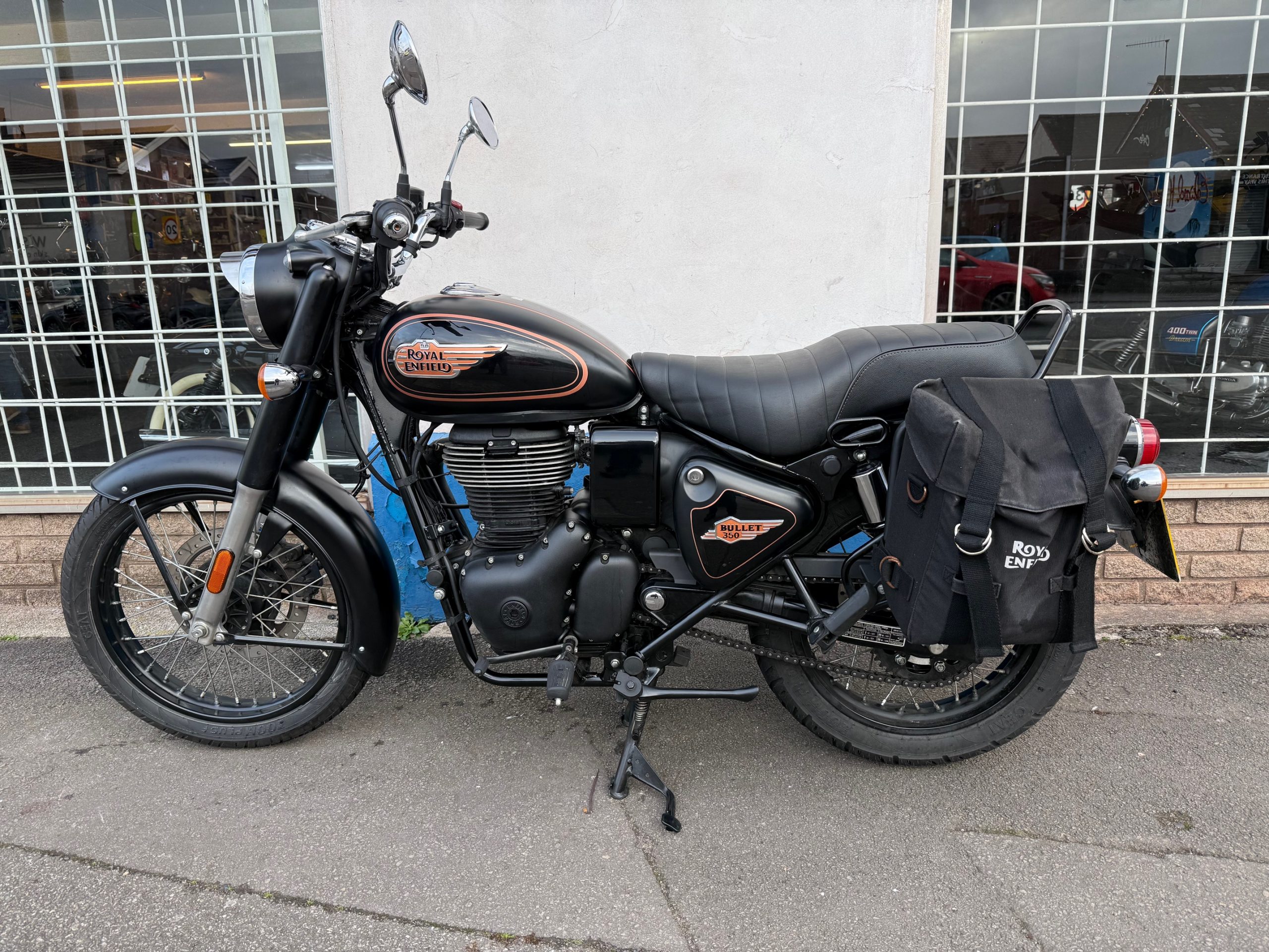2025 Royal Enfield Bullet 350 in Black Gold, 9257miles, service history, in excellent condition and fitted with pannier bags.