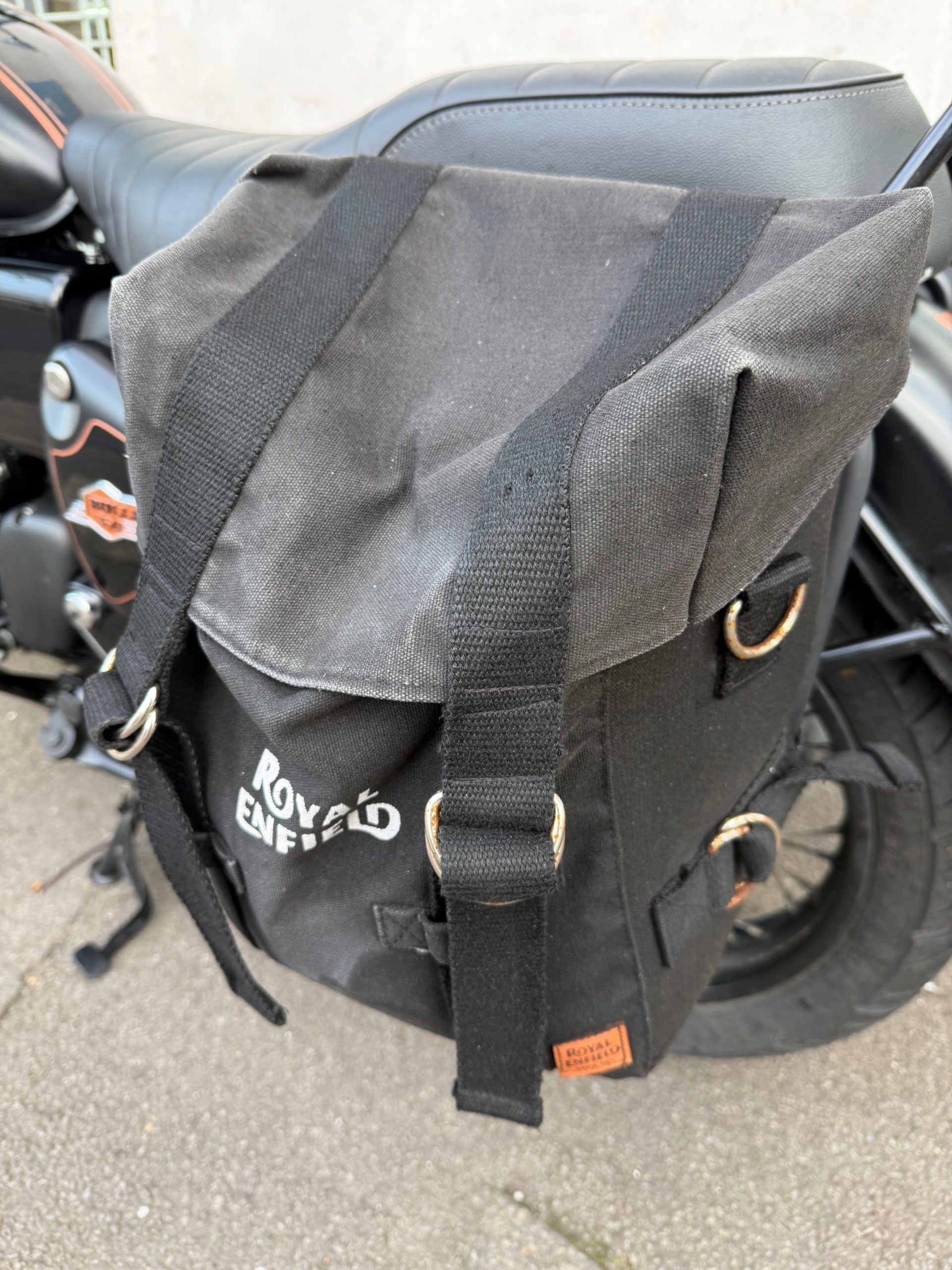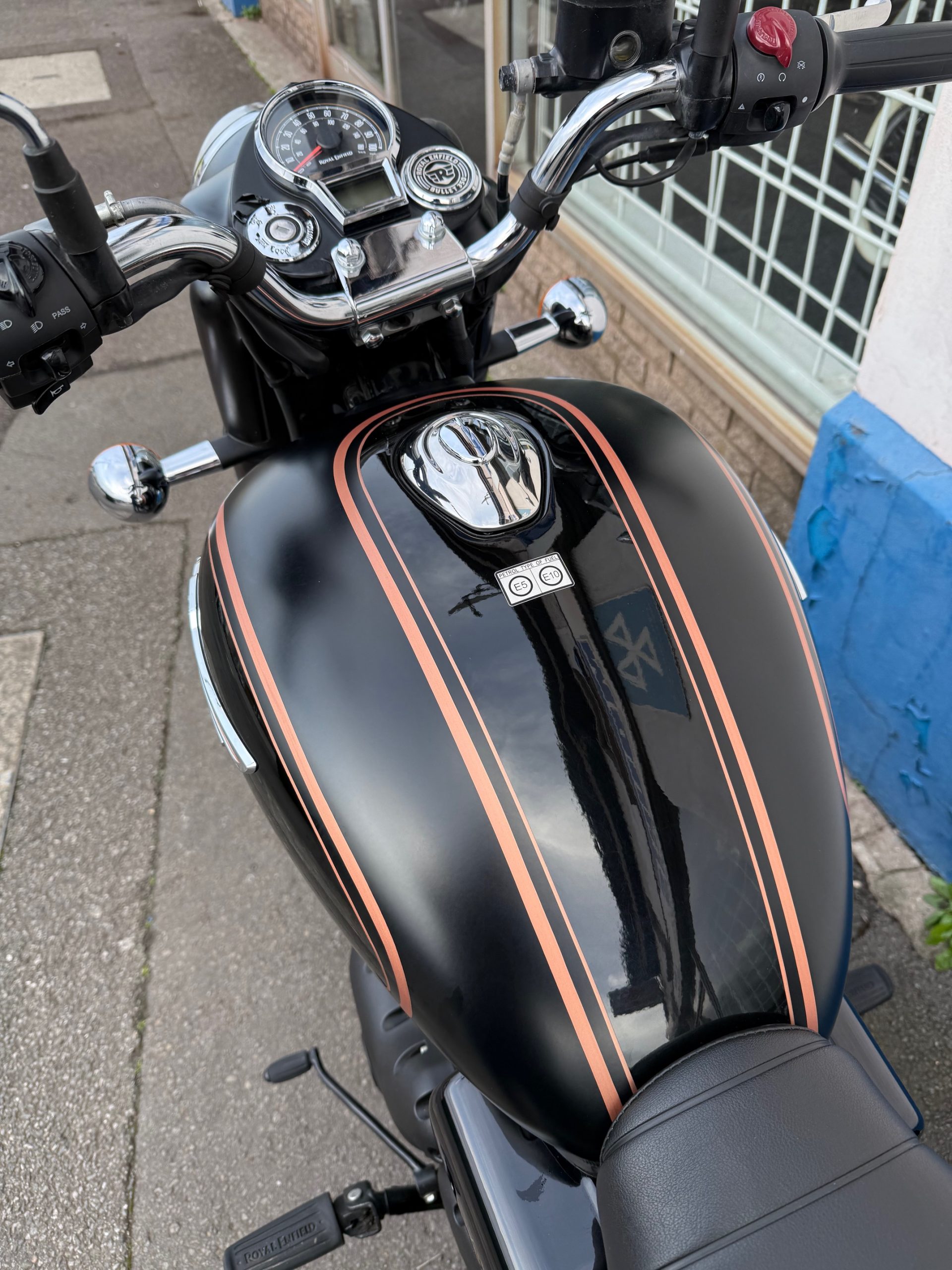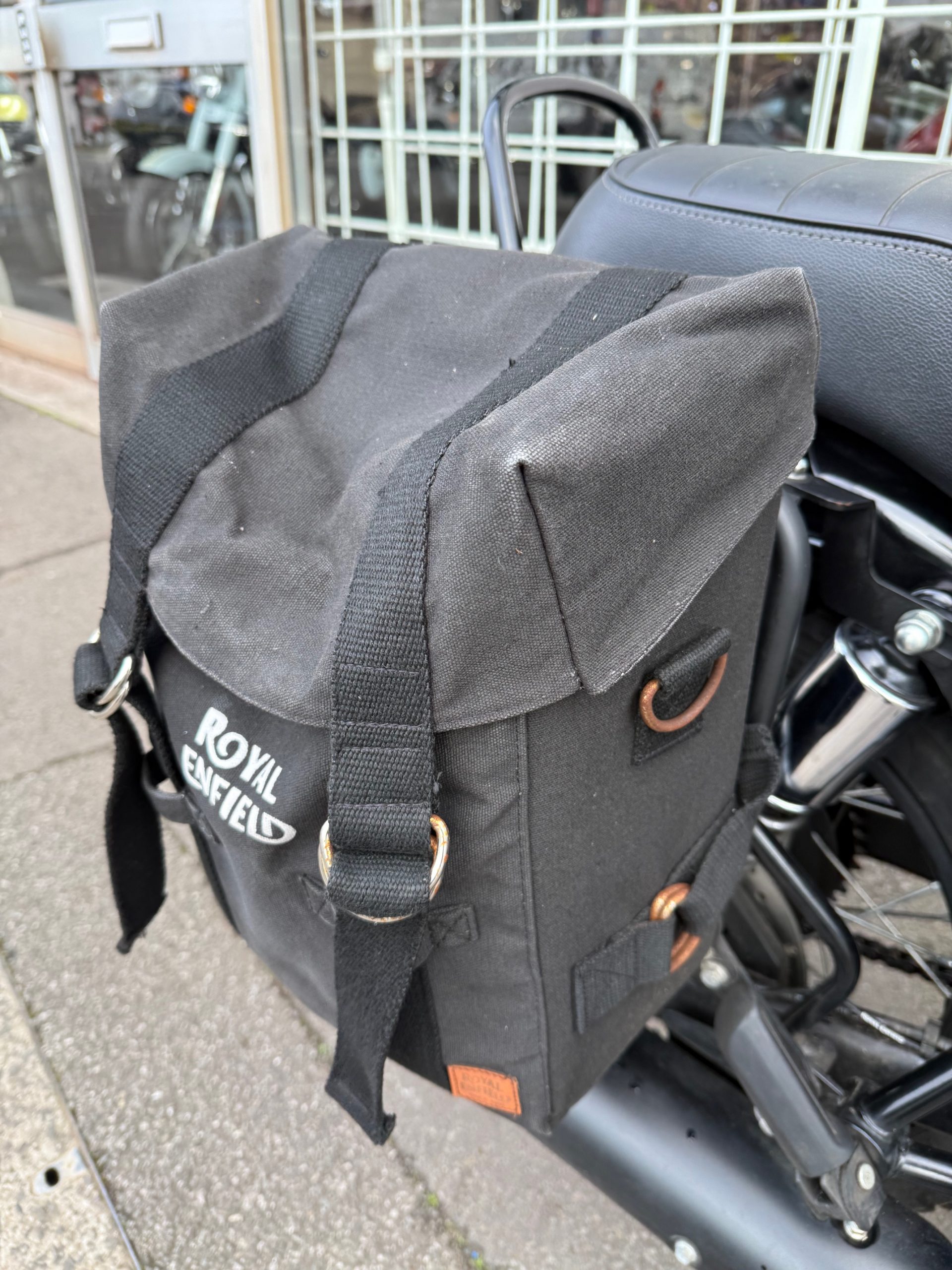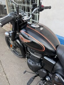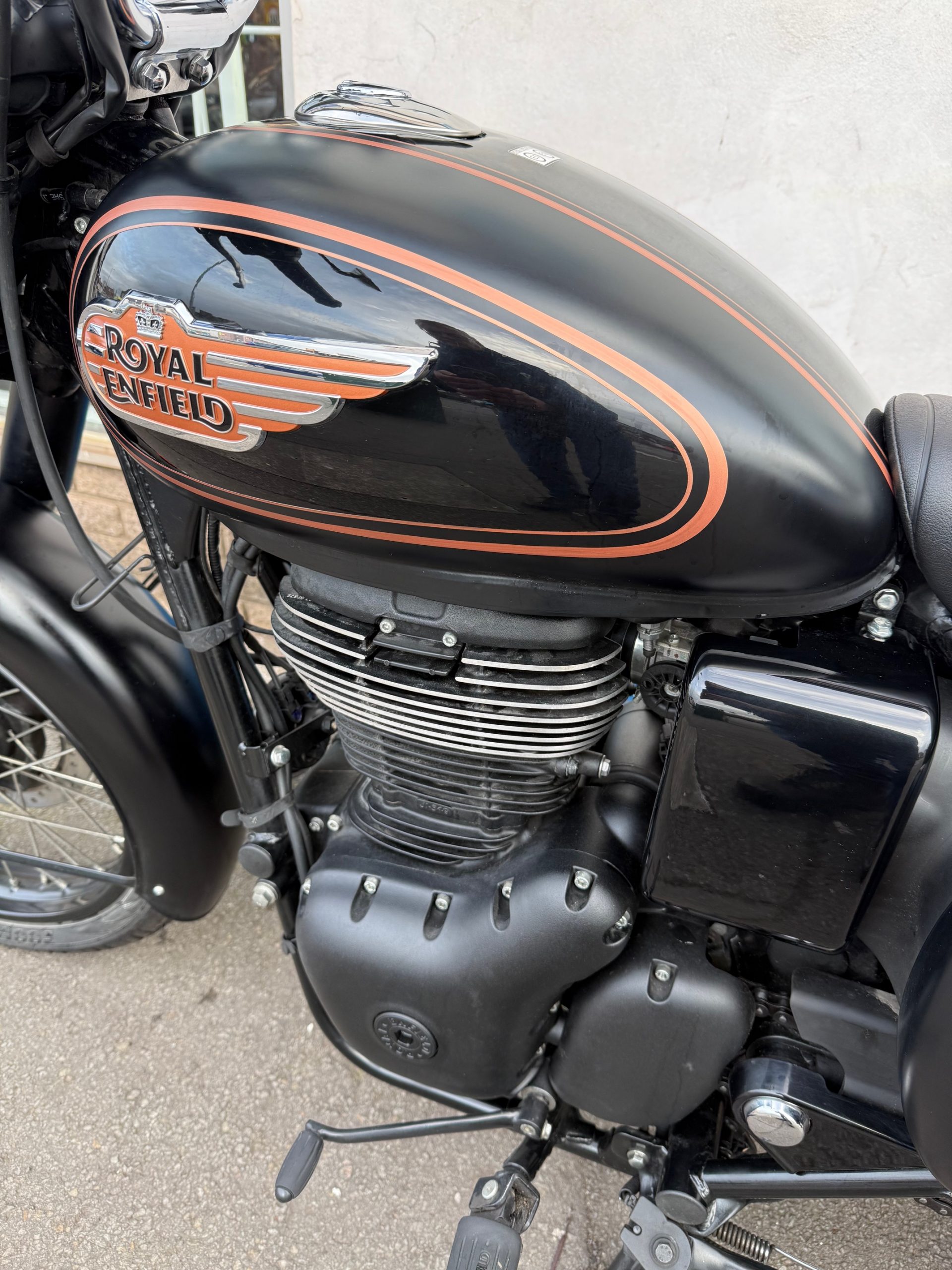 2025 Royal Enfield Bullet 350 in Black Gold, 9257miles, service history, in excellent condition and fitted with pannier bags.