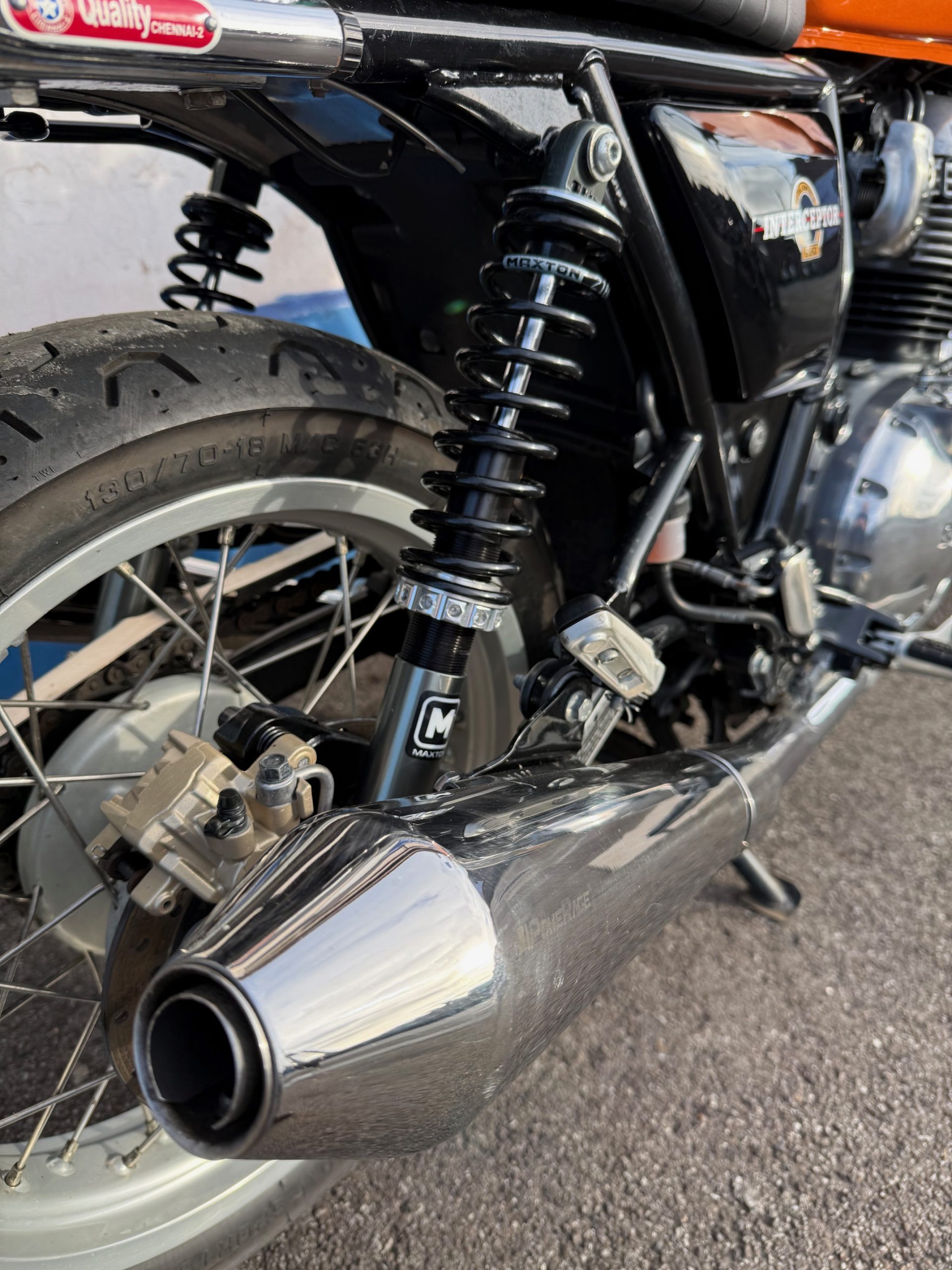 On the road, the Interceptor 650 delivers a smooth, friendly and engaging ride thanks to its 648 cc air-/oil-cooled parallel twin. The engine’s gentle torque curve, balanced chassis and predictable handling make it ideal for city rides, weekend back-roads and everything in between. Suspension and braking components are deliberately simple but well-tuned, giving the bike a reassuring feel without over-complication. The result is a motorcycle that blends classic looks with modern usability.