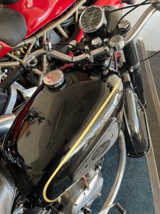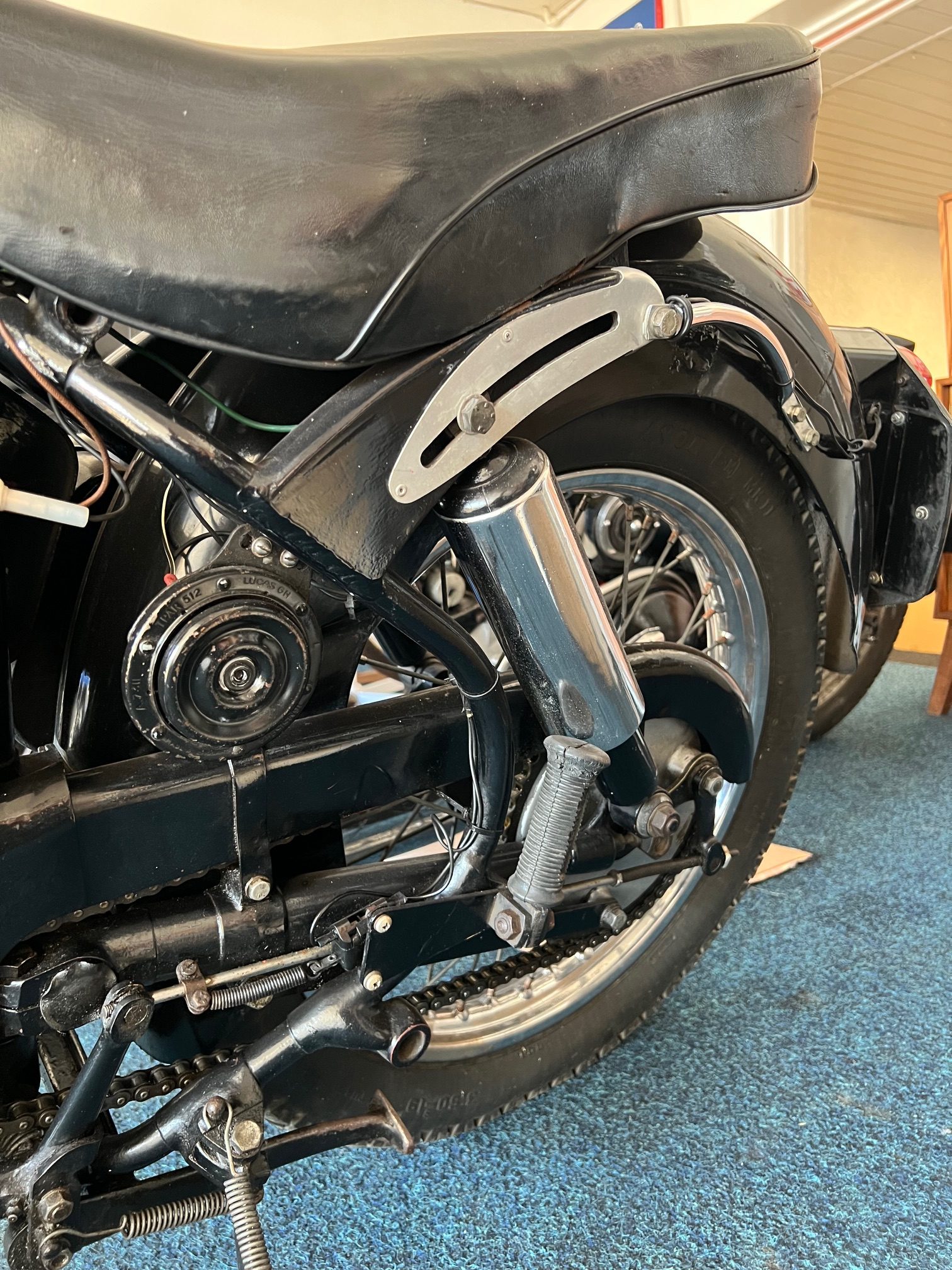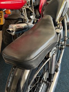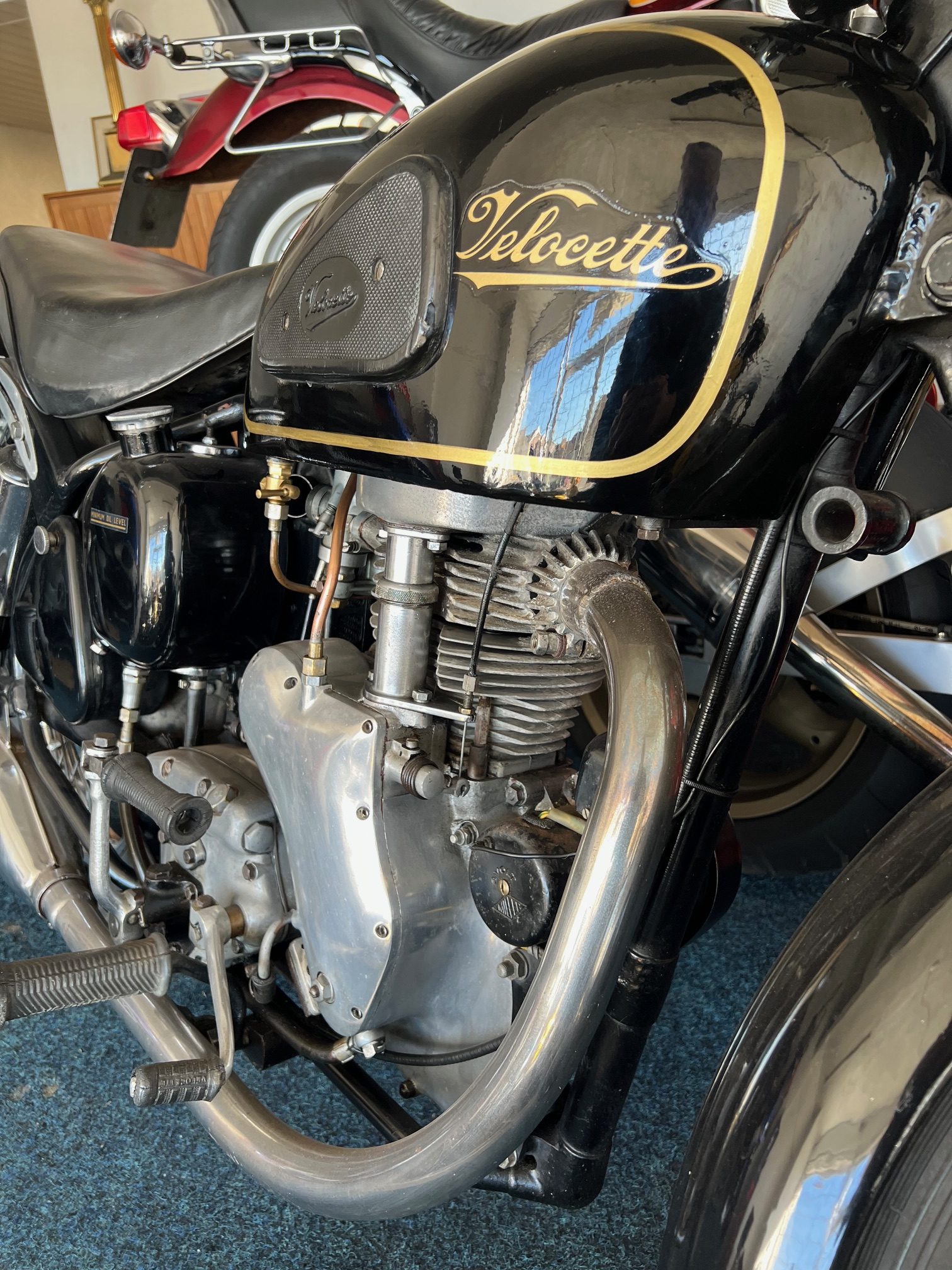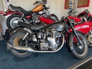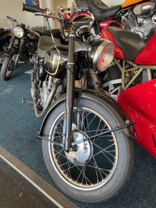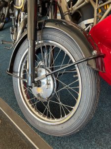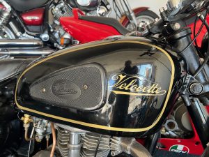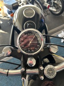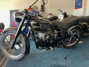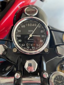 By 1955, the Velocette MAC 350 featured a swingarm rear suspension, replacing the earlier rigid frame, significantly improving rider comfort and control. The motorcycle used a four-speed gearbox with a right-side foot shift, a common setup for British bikes of the era. The single Amal carburetor provided consistent fuelling, and the bike’s drum brakes—though basic by modern standards—were more than adequate for the speeds it could reach. The MAC 350 was well-regarded for its smooth ride and fuel efficiency, making it a practical choice for riders seeking a blend of performance and economy. Today, it remains a sought-after classic, appreciated for its craftsmanship, simplicity, and connection to Velocette’s storied racing heritage.